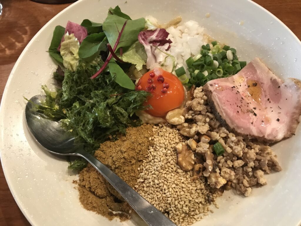 とにかく見た目がきれい!葉物野菜・あおさ・蒸し鶏・チャーシュー・ナッツ・ゴマ・ネギ・魚粉・卵…などなどふんだんに色彩豊かに盛り付けてあります。そしてなんといってもタレが独特で、和食のようで、洋食のようで、エスニックのような…何とも言えない、食べたことのない感じの味がします。それがめちゃくちゃおいしいんです。店主さんに聞くと、この調合は「偶然できた」らしい…。まさにミラクルです。ちなみに、夜は同じ店主さんが経営するイタリアンバーになります。